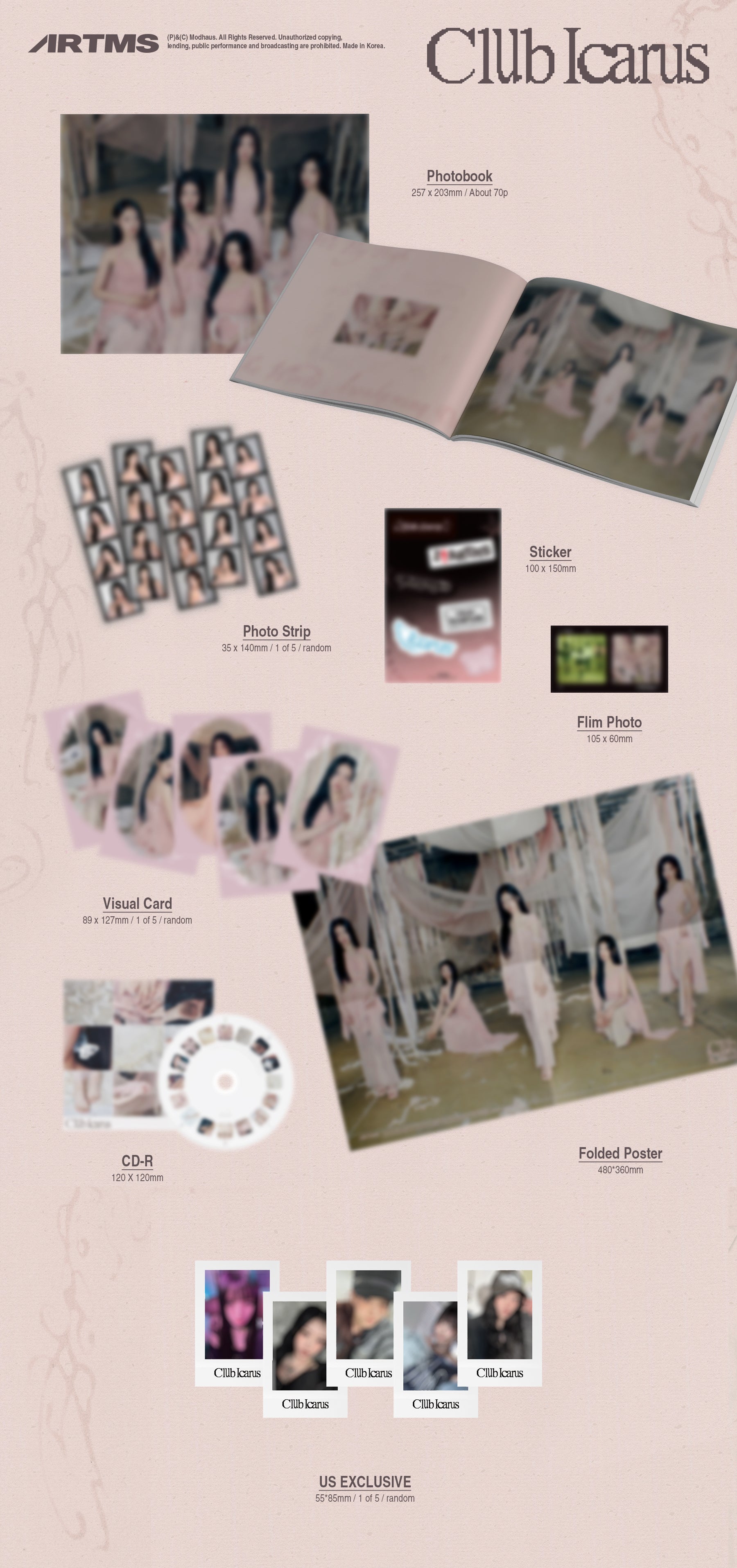 Description: Photobook, CD-R, CD envelope, Folded Poster, Visual Card (1 of 5 random), Sticker, Film Photo, Photo Strip (1 of 5 random), US Exclusive Photocard (1 of 5 random)